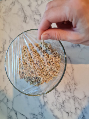 Затяните посуду пищевой пленкой. С помощью зубочистки сделайте множество проколов, чтобы к крупе поступал воздух. Уберите гречку в теплое темное место на сутки. Я поставила в кухонный шкаф.