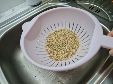 Если у вас гречка будет замачиваться дольше, ничего страшного. Главное не держать ее в воде более 10 часов. Тогда в ней начнется процессы брожения, а нам этого не нужно. Далее набухшую гречку промойте, чтобы избавиться от слизи, которая образуется при замачивании. Промывать лучше в сите или дуршлаге. Только смотрите, чтобы отверстия были не слишком крупные, чтобы зерна не выскочили. Промывайте под проточной водой, перебирая крупу пальцами.