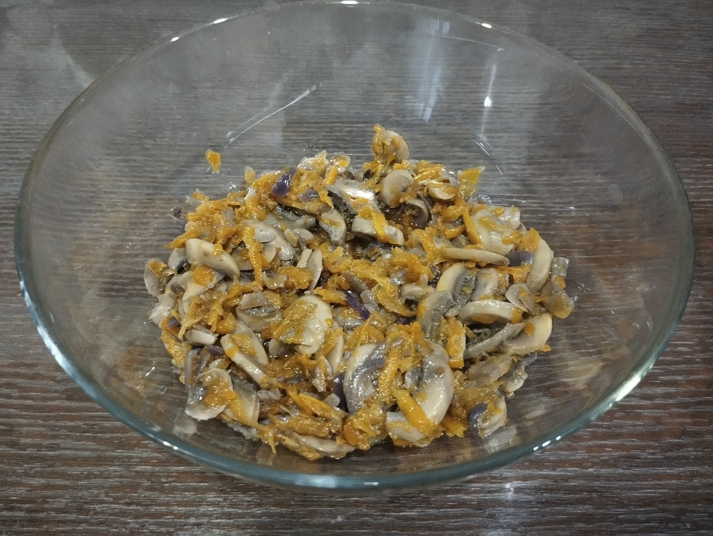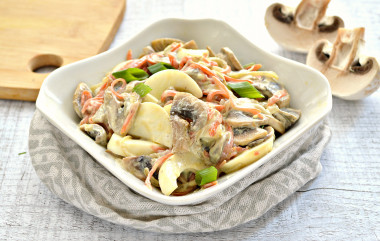 В составе грибного салата – привычные ингредиенты, сочетание которых дает нам возможность угостить своих домочадцев или друзей вкусным и довольно сытным блюдом. Приготовила для вечерних посиделок, всем очень понравилось! От себя добавила истолченного чеснока для пикантности вкуса (1 зубчик). По соседству с салатом с грибами морковью и луком расположила запеченный картофель, вообще круто вышло! Рекомендую!