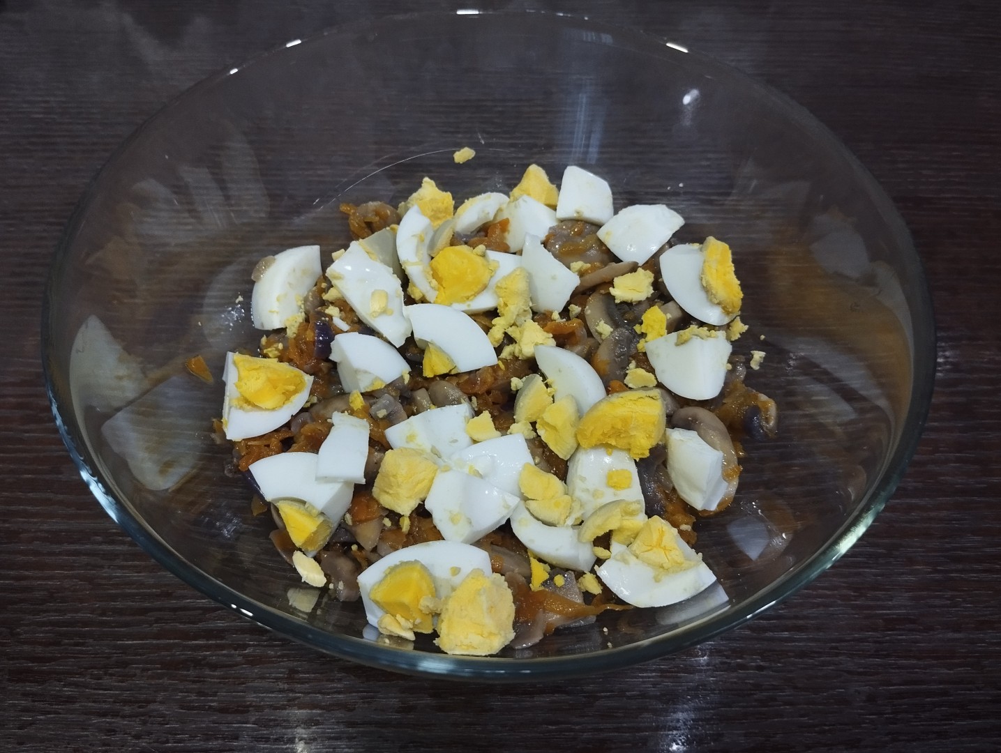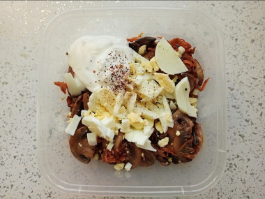 Я взяла свежие шампиньоны, помыла, обсушила и нарезала их на пластинки. Сначала стала обжаривать грибы, чтобы из них вышел сок, а потом выложила в сковороду лук и морковь. В конце посолила. Яйца тоже нарезала пластинками. Заправлять решила сметаной, чтобы уменьшить калорийность. Так же добавила свежемолотую смесь перцев.
