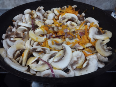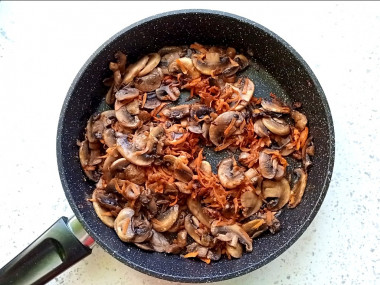 Сковороду с маслом разогрейте и выложите на нее нарезанные шампиньоны, морковь и репчатый лук. На среднем огне обжарьте всё вместе, постоянно помешивая, до мягкости овощей. Снимите сковороду с огня и и дайте овощам с грибами остыть.
