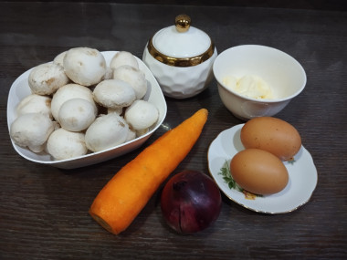 Как сделать салат с грибами морковью луком? Подготовьте продукты. Я готовлю со свежими шампиньонами среднего размера. Можно взять и замороженные - порезанные или целые, но готовить их чуть дольше, до выпаривания жидкости. В зависимости от размера грибов резать их можно по-разному. Свежая морковь и репчатый лук среднего размера, яйца я взяла СО. Яйца предварительно отварите и охладите в холодной воде. Для заправки салата у меня майонез, можете его заменить.