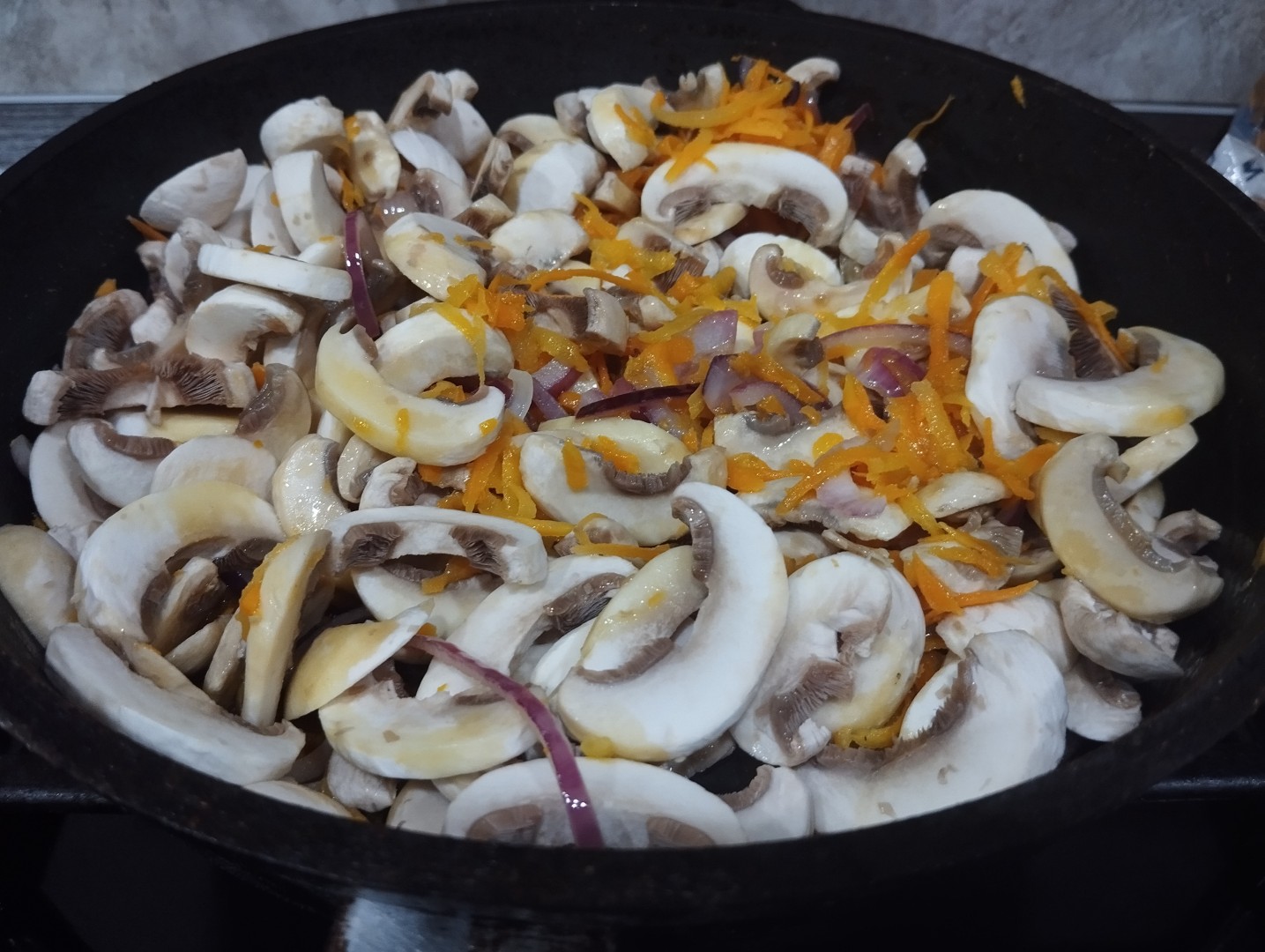 Обжарила лук с морковью, добавила грибы,порезанные пластинками.