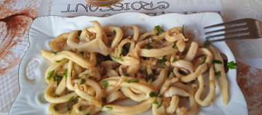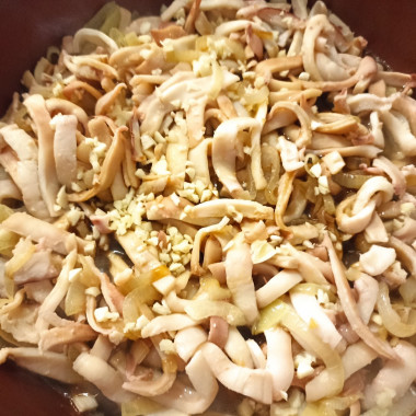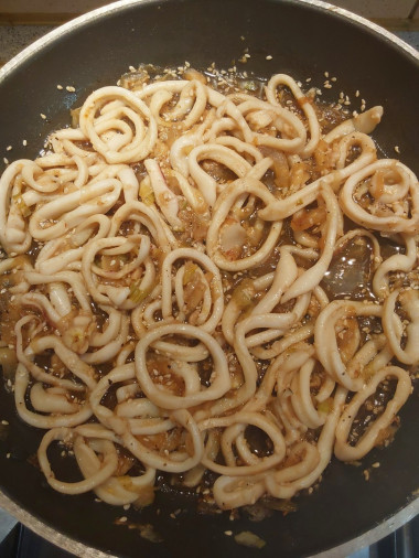 Кальмары жареные в соевом соусе с чесноком на сковороде