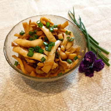 Очистите кальмары от плёнки, удалите внутренности и промойте холодной водой. Обсушите кальмаров бумажным полотенцем и порежьте соломкой.