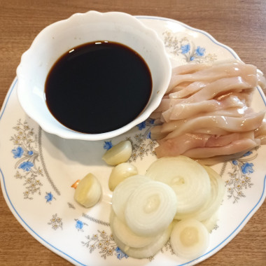 Калорийность продуктов: Кальмары, Лук репчатый, Чеснок, Соевый соус, Растительное масло, Мёд, Соль, Перец черный молотый