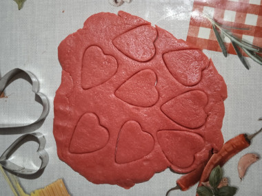 Из готового теста раскатайте пласт, толщиной 5-7 мм и вырежьте из него печенье любой формы. Выложите печеньки на противень, застеленный кулинарной бумагой и поставьте в духовку, предварительно разогретую до 180 градусов, минут на 15. Ориентируйтесь по своей духовке. Готовится печенье очень быстро.