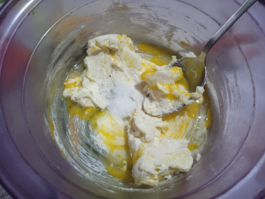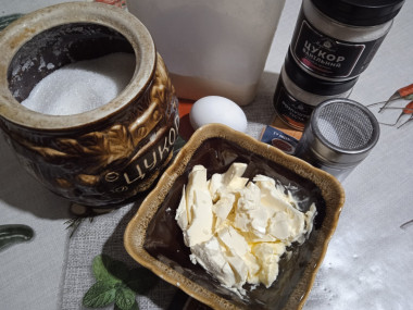 Затем всыпьте разрыхлитель, щепотку соли и ванилина. Начинайте постепенно добавлять муку и замешивать тесто. Сразу всю муку добавлять не надо. Её может понадобиться чуть больше или меньше. Ориентируйтесь на консистенцию теста.