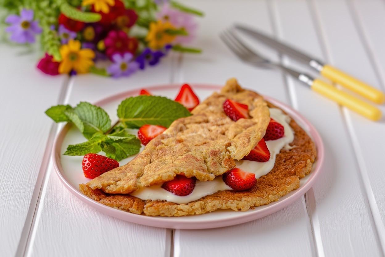 Подавать овсяноблин можете с разными начинками, сладкими или солеными. Я подавала с творожным кремом и ягодами. Приятного аппетита!