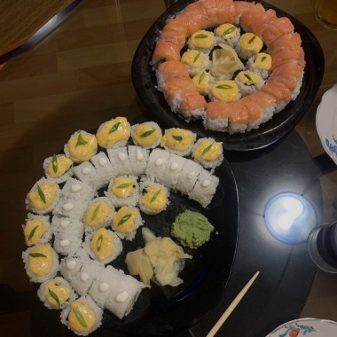 Как-то заказывали доставку роллов и там были запечённые роллы с шапочкой. Сейчас я в основном делаю роллы сама, поэтому такой тоже захотелось приготовить. И вот нашла рецепт. Для начинки использовала крабовые палочки, крем-сыр, огурцы и плавленный сырок, в общем все то, что нашлось в холодильнике) В шапочку, помимо указанного в рецепте, добавила натёртый на мелкой тёрке сыр, молодой человек очень его любит. Я запекала ролл не на режиме гриль, поэтому наверно такая корочка, как на фото в рецепте, не образовалась( Ну и ладно, на вкус это особо не повлияло) Украсила роллы зелёным луком, ну и конечно имбирь с васаби) Спасибо за рецепт!
