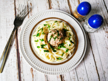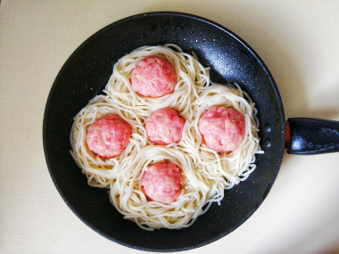 Отварив спагетти, выложила их на сковородку, сформировав четыре гнёздышка. Поместила в них четыре тефтельки, пятую положила в середину. Залила все подливкой из жареного лука и воды, почти полностью закрыв спагетти и тефтельки (взяла воду вместо мясного бульона, так как рецепт это допускал). Томатную пасту в подливку добавлять не стала.