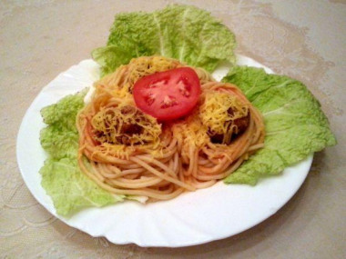 Теперь отвариваем макароны обычным для себя способом. Формируем из них штук 12 так называемых «гнездышек». В центр каждого гнезда кладем по одной круглой тефтелине, слепленной из фарша. Все гнезда выкладываем в сковородку с высокими стенками. Заливаем томатной подливкой. Накрываем крышкой и держим на медленном огне до полной готовности. На это уйдет около 20-ти минут.