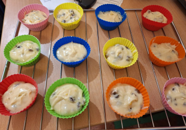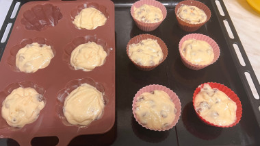 Выложите тесто в порционные формочки для кексов. Заполняйте формочки тестом на 3/4 высоты, так как при выпечке кексы немного поднимутся.