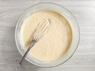 Венчиком замесите тесто, чтобы не было комочков муки. Оно должно быть как густая сметана. Вот здесь, при необходимости добавьте еще муки. Ориентируйтесь на консистенцию готового теста.