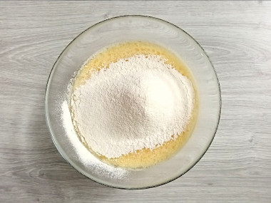 Затем добавьте смесь из сухих ингредиентов - соль, сахар, разрыхлитель и почти всю муку. Немного муки оставьте, чтобы позже отследить нужную консистенцию теста.