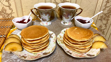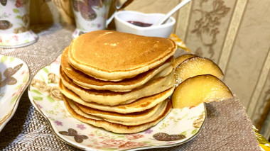 Получается около 15-17 панкейков. Точное количество зависит от диаметра используемой сковороды, а, следовательно, и размера панкейков, а также от того, насколько толстые панкейки вы будете жарить (сколько теста вы будет наливать на сковороду).