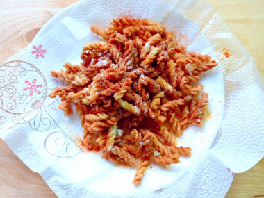 Когда масло впитается в полотенца, обжаренные макароны переместите в контейнер, сверху засыпьте солью и своими любимыми специями, закройте контейнер крышкой и начните встряхивать макароны, чтобы все специи равномерно распределились.