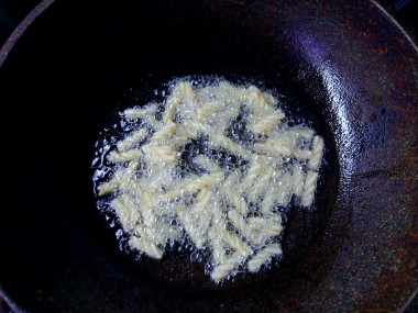 В ковшике разогрейте растительное масло. Когда масло прогреется, опустить в него первую порцию запанированных в муке макарон. Обжарьте их до образования золотистого цвета в течение нескольких минут. Также обжарить в кляре оставшиеся макароны. После чего выложить их на бумажные полотенца, чтобы удалить лишнее масло. После обжарки макароны должны стать твердыми и плотными.