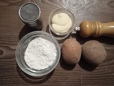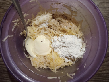 Далее смешайте в отдельной емкости натертый картофель, просеянную пшеничную муку, картофельный крахмал и соль.