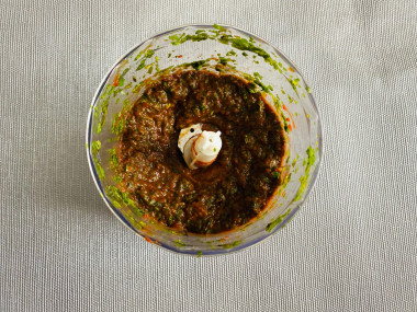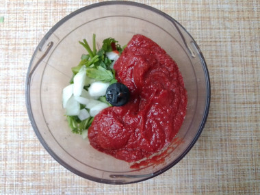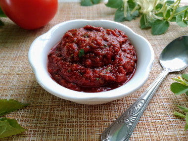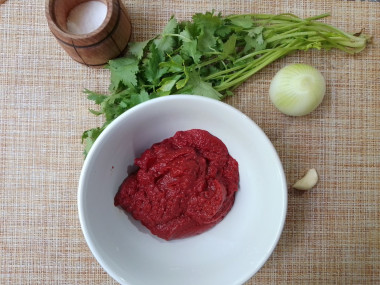Рецепт очень легкий, томатная паста, кинза, лук, чеснок, все измельчила в блендере, добавила специи и соль и соус готов.