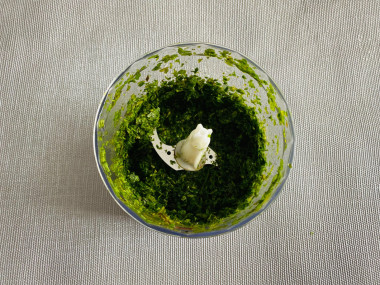 В это время займитесь другими ингредиентами. Чеснок очистите от кожуры, ополосните и натрите на мелкой тёрке. Как вариант можно пропустить зубки через пресс. Зелень тщательно ополосните и обсушите бумажными салфетками, чтобы убрать остатки воды. В чашу блендера отправьте томатный соус, чеснок и маринованный лук.