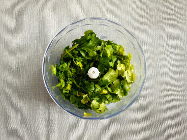 Зелень кинзы и петрушку нашинкуйте мелко и отправьте в блендер ко всем остальным компонентам.