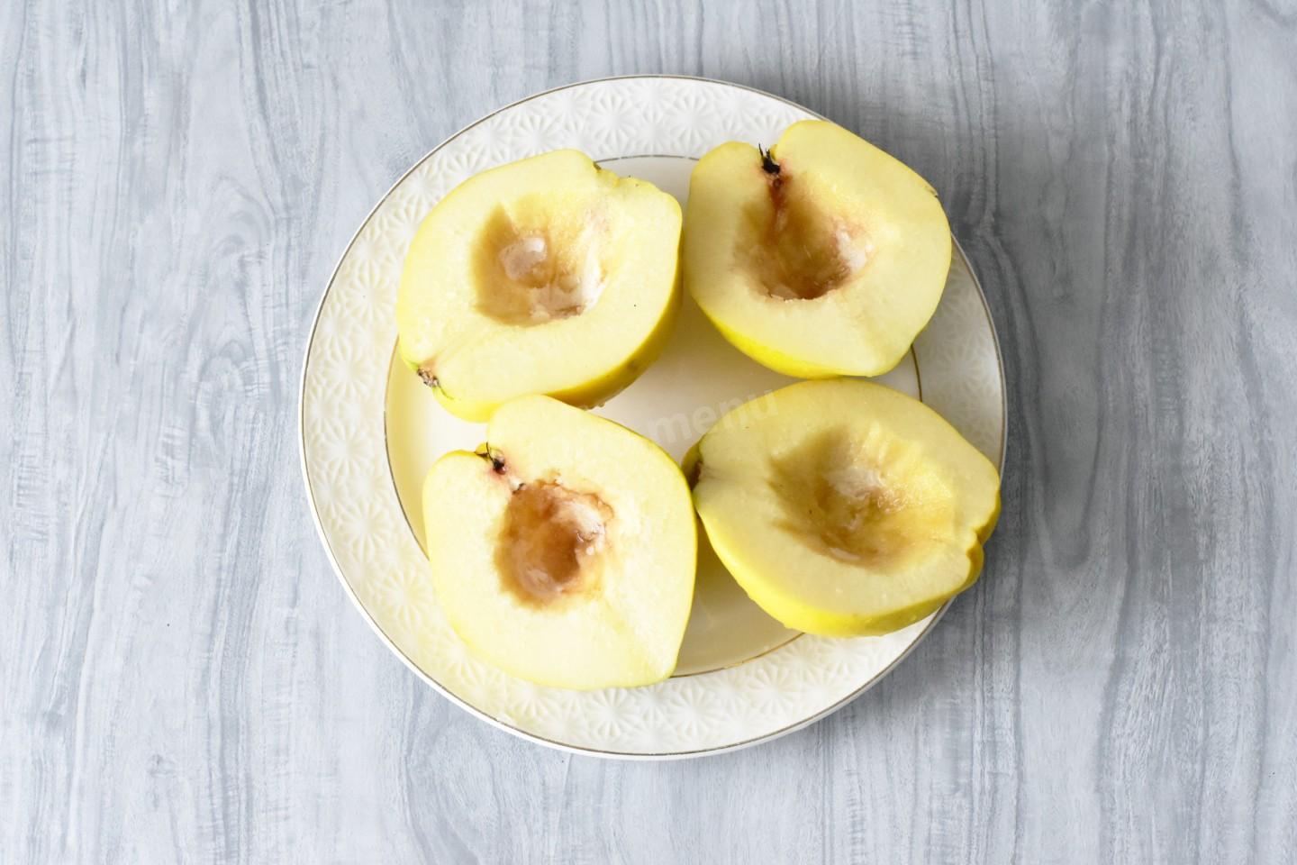 Айву вымойте, обсушите и разрежьте вдоль пополам. Аккуратно, чтобы не повредить стенки, вырежьте сердцевину с семенами. Если фрукты неустойчивы, слегка срежьте их снизу. Если айва быстро темнеет, сбрызните ее лимонным соком.