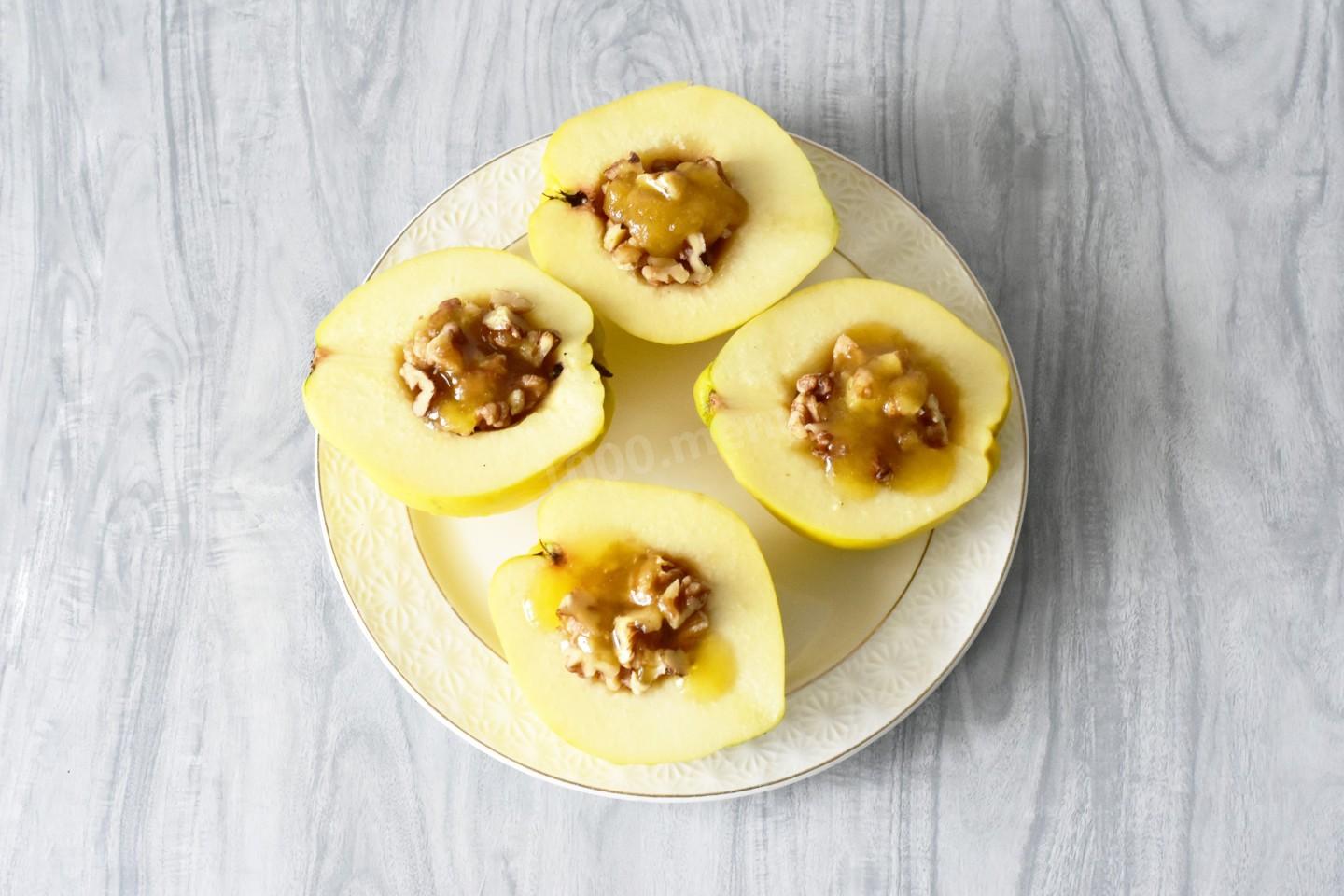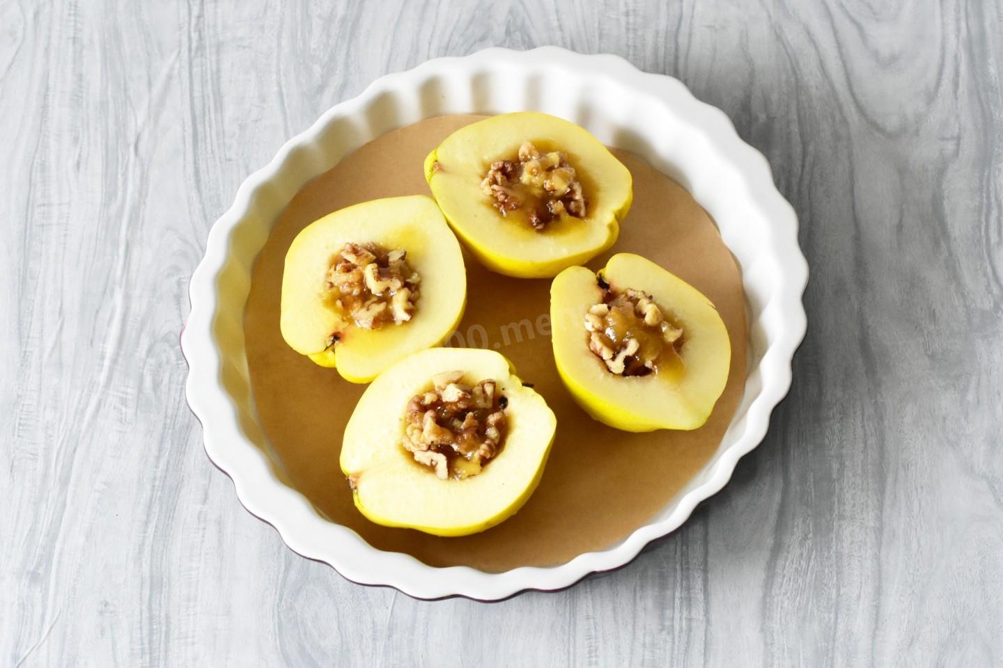 Наполните половинки айвы грецкими орехами. Сверху выложите по 1 ст. л. меда. Половинки айвы выложите в застеленную пергаментом форму для запекания.