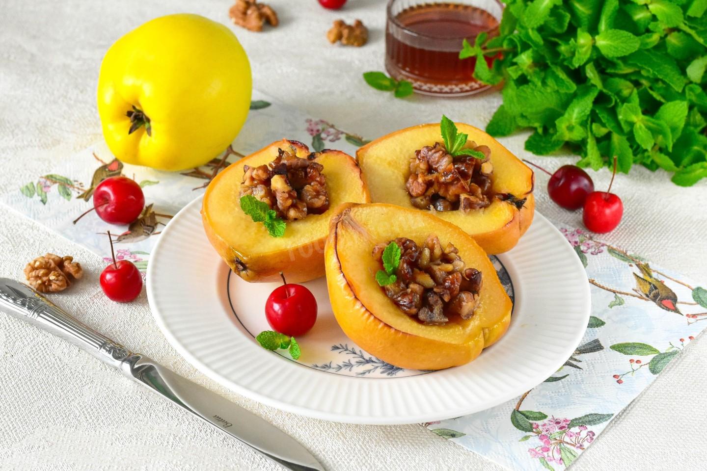 Запеченную айву с медом и орехами переложите на тарелку и подайте к столу. Приятного аппетита!