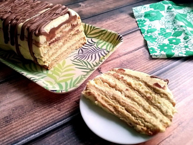 Для торта взяла песочное печенье прямоугольной формы, чтобы оно свободно помещалось в силиконовую форму. Мне кажется так удобнее собирать). Заварной крем сварила легко, он получился однородный, гладкий и сладкий. Правда я решила взбить заварную основу со сливочным маслом и крем немного расслоился. Все же лучше было просто добавить его в тёплый крем. Про орехи я совсем забыла, с ними было бы интереснее. Тортик собирала в застеленной пищевой плёнкой форме. Сначала выложила толстый слой крема, чтобы верхушка была аппетитнее. А затем прослаивала печенье, крема получилось много, поэтому не жалела его. Заполнила форму до самого верха, последний слой сделала из печенья. Охлаждала заготовку всю ночь, а утром перевернула на поднос и сняла плёнку. Украсила шоколадом. Растопила его в горячей воде. Для этого поломала его на кусочки, сложила в кулинарный мешок и опустила в стакан с горячей водой. Спустя минут пять шоколад растопился. Кстати на холодном тортике шоколад быстро застывает.