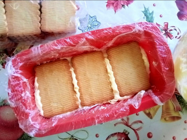 Далее начните собирать торт. Для этого возьмите подходящую форму и застелите ее пищевой пленкой. Берите по одному печенью и намазывайте его слоем крема.