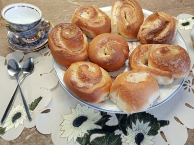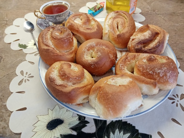 Булочки очень воздушные и сдобные. Рецепт по сравнению с другими более прост в исполнении, тоже был плачевный опыт приготовления. Но так как я любитель булочек с начинкой, решила запечатать в каждую булочку по кураге и кусочек яблока из варенья, получилось очень вкусно. Лучше конечно добавлять варенье, потому что булочки сами по себе суховаты, а сверху можно глазурью полить. Спасибо за рецепт основу.