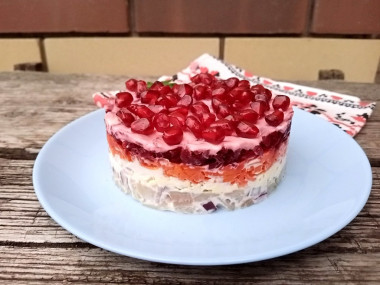 Салат собирала порционно слоями в небольшом кольце. После того как покрыла майонезом свеклу, поставила салат в холодильник до окрашивания соуса в розовый цвет. Потом посыпала поверхность зёрнами граната и сняла кольцо.
