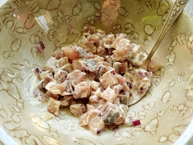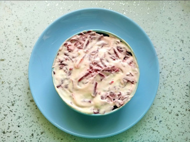 Также в качестве заправки можно использовать не только майонез, но и сметану или натуральный йогурт. Их можно взять по отдельности либо смешать с майонезом в любой пропорции на свой вкус - это снизит калорийность блюда.