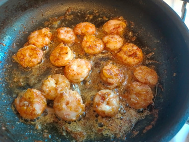 В сковороде с толстым дном разогрейте растительное масло. Отправьте креветки обжариваться. Готовьте до тех пор, пока они не начнут скручиваться в колечки и не приобретут красноватый оттенок. Постоянно помешивайте, чтобы креветки приготовились равномерно. Я обжаривала около 6-8 минут.