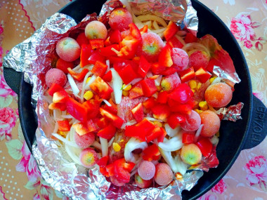 Блюдо совсем несложное по своему исполнению. Из овощей добавила болгарский перец, обычный репчатый лук, помидоры черри (замороженные) и консервированную кукурузу. Кроме соли и перца использовала мускатный орех.