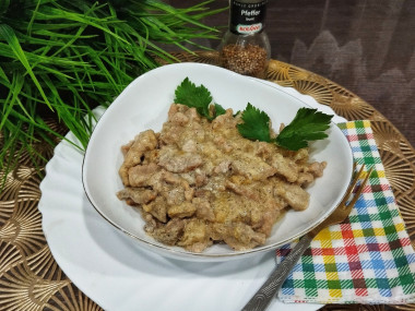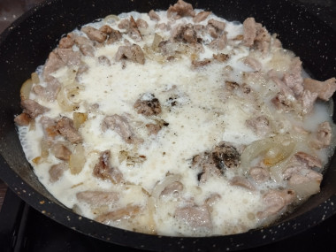 Все посолите, поперчите и влейте в сковороду сливки. Сливки лучше всего брать 10-20%, тогда мясо получится нежным и не очень жирным. Не советую заменять сливки молоком, в процессе приготовления оно свернется хлопьями.