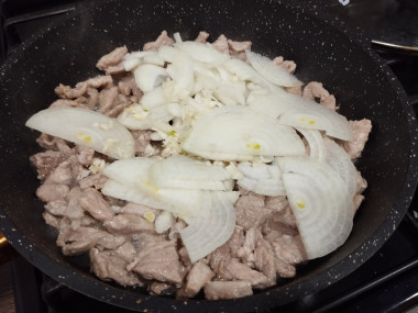 Лук почистите, порежьте полукольцами и положите в сковороду со свининой. Лук можно брать совершенно любой, только учтите, что красный лук посинеет и будет выглядеть не очень аппетитно.