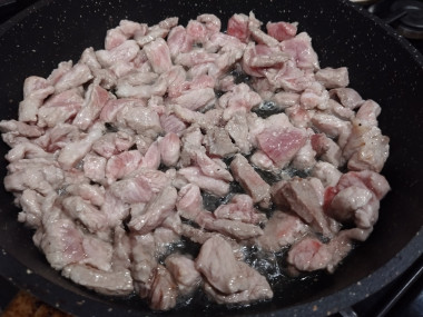 В сковороду налейте растительное масло и разогрейте на среднем огне. Положите порезанное мясо и обжаривайте в течение 3 минут, перемешивая. Мясо должно побелеть, но не зажариться.