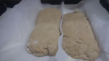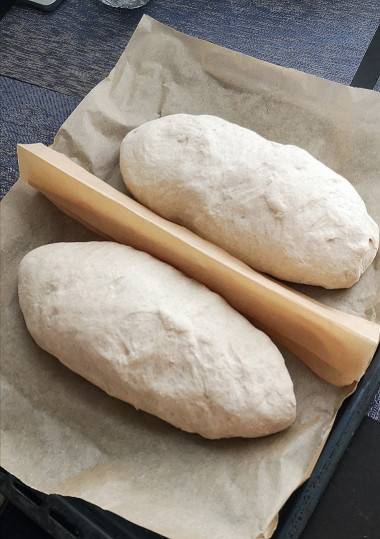 Сформируйте 2 продолговатые и плоские заготовки. Не забывайте, что обминать тесто нельзя, только растягивать. Я подравняла края широким ножом, как бы подтыкая их под низ и немного растянула. Не старайтесь сделать слишком ровными заготовки, чиабатта не имеет идеальной формы.