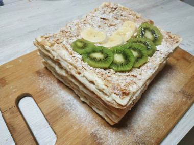Я не крошила одну пластину, а с каждой руками стаскивала загорелый слой. Этого хватило, чтобы обсыпать верх торта. Украсила киви и бананами. А чтобы бананы не потемнели, посыпала сахарной пудрой. Чернику в поселке не найти, а вот киви доченька очень любит!поэтому Наполеон мой внешне немного другой.