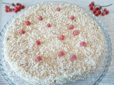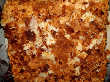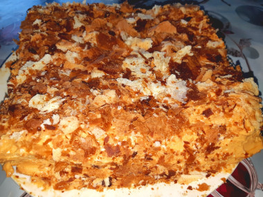 Верх и бока торта смажьте остатками крема и обсыпьте крошкой. Можете подавать торт сразу, пока он хрустящий или дать постоять в холодильнике 3-4 часа для пропитки.