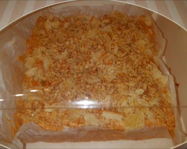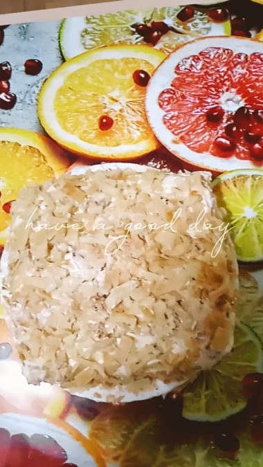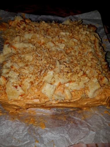 Крем-вареная сгущенка+сливочное масло пачка. Верх крошка+ грецкий орех)