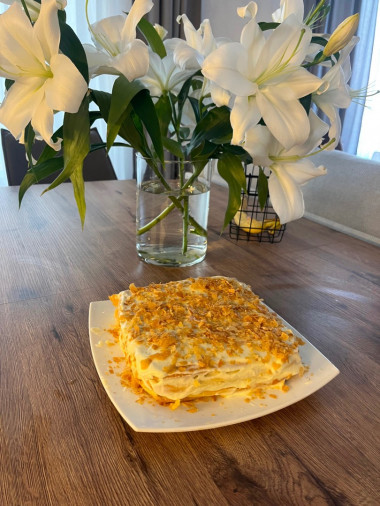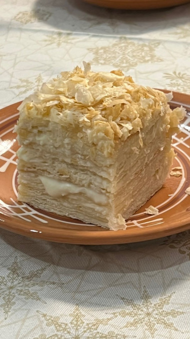 У моей доченьки завтра день рождения! Я приготовила для нее торт Наполеон по рецепту Марии. Я в восторге от начинки! По вкусу напоминает ванильное мороженое.