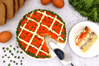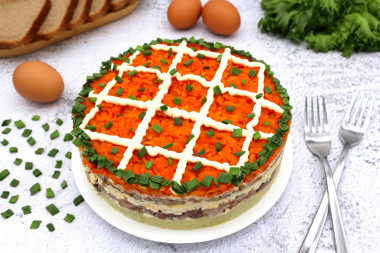 Смажьте немного майонезом и сделайте последний слой из натертой а крупную терку моркови.