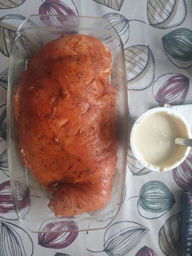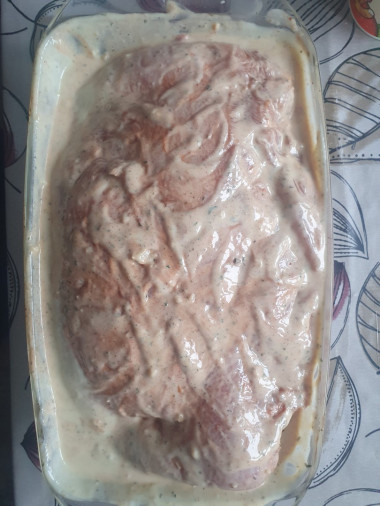 Заранее замариновала мясо в специях и соли на 20 минут, в этом время уже подготовила соус из сметаны, мёда, чеснока и горчицы, оставила мясо на ночь в холодильнике. Горчицы использовала только один вид - русскую.