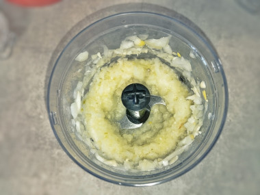 Нарезанное мясо пропустите через мясорубку с большими отверстиями, чтоб кусочки фарша были крупнее. Лук и чеснок очистите и промойте в холодной воде. Затем пропустите очищенный лук через мясорубку, следом за мясом. Очищенный чеснок выжмите с помощью чеснокодавилки. Измельченные лук и чеснок добавьте в чашу к фаршу.