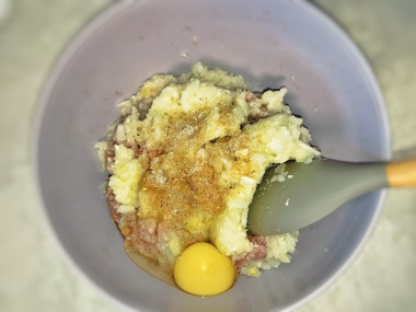 Всю массу очень хорошо перемешайте руками. Если фарш, на ваш взгляд, жидковат, то можно добавить немного крахмала. Затем отбейте готовый фарш о дно чаши до вязкого состояния. Это необходимо для того, чтобы масса стала более плотной и не разваливалась в процессе запекания. Готовую мясную массу поставьте в холодильник на 30 минут, чтобы хорошо охладить.