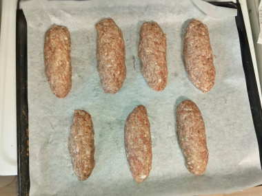 Люля кебаб на противне в духовке оказалось удивительно вкусным блюдом и очень простым в приготовлении! Когда нет возможности жарить на мангале, этот рецепт становится настоящей находкой. Начала с домашнего готового фарша, в который добавила много измельчённого в блендере лука и чеснока. После соединения фарша с яйцом, солью, чёрным перцем и прочими любимыми специями, получилась отличная мясная масса. Лепила её в виде небольших котлеток-колбасок и выкладывала на противень.