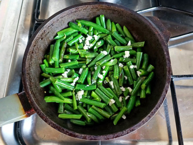 Есть два способа обработки стручков. Первый: фасоль можно закинуть в кипящую воду и готовить до того момента, пока стручки не станут мягкими. Второй: в сковороду налить 2 столовые ложки растительного масла без запаха, разогреть его, отправить фасоль и мелко нарубленный чеснок обжариваться до мягкости. Мне больше нравится второй вариант, поэтому чаще фасоль я обжариваю. Подробнее о выборе сковороды и масла для жарки, а также идеальной кастрюли читайте ниже.